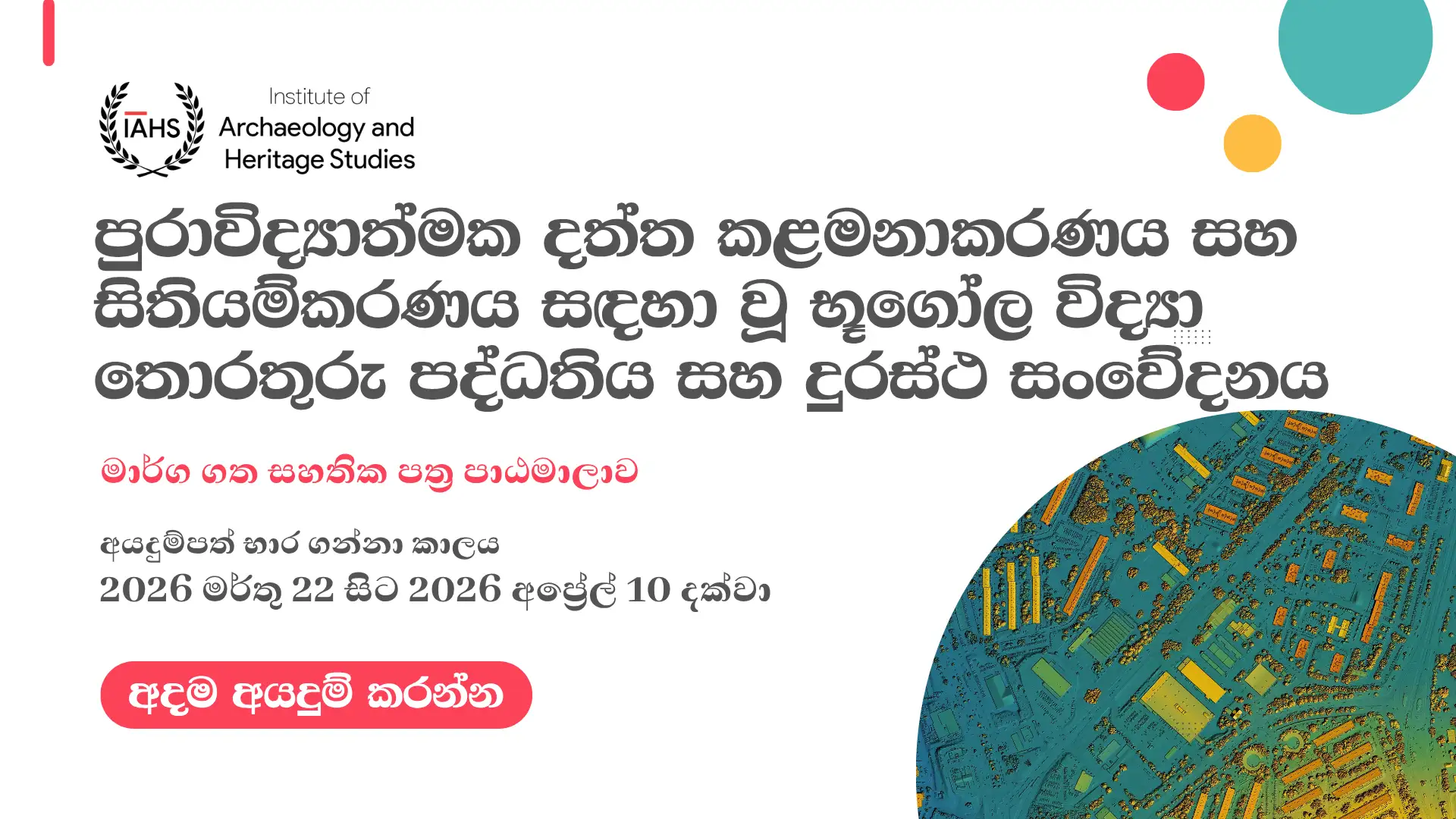 මෙය භූගෝලීය තොරතුරු පද්ධතිය (GIS) සහ දුරස්ථ සන්වේදනය (Remote Sensing) පිළිබඳ මූලික හැඳින්වීමක් ශ්රී ලංකාවට අදාළ පුරාවිද්යාත්මක යෙදුම් පිළිබඳ විශේෂ අවධාරණයක් සහිත ව ලබා දෙන පාඨමාලාවකි.